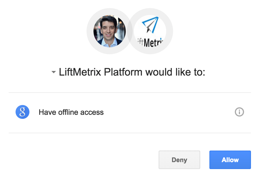 2.) You will be asked to authorize your Google Analytics account with LiftMetrix. To do so, login to Google with the email address that has access to the GA account you want to add. By  clicking "Allow", LiftMetrix receives Read-Only access to your data, allowing us to analyze the traffic, goals completions and conversions from your social media.
