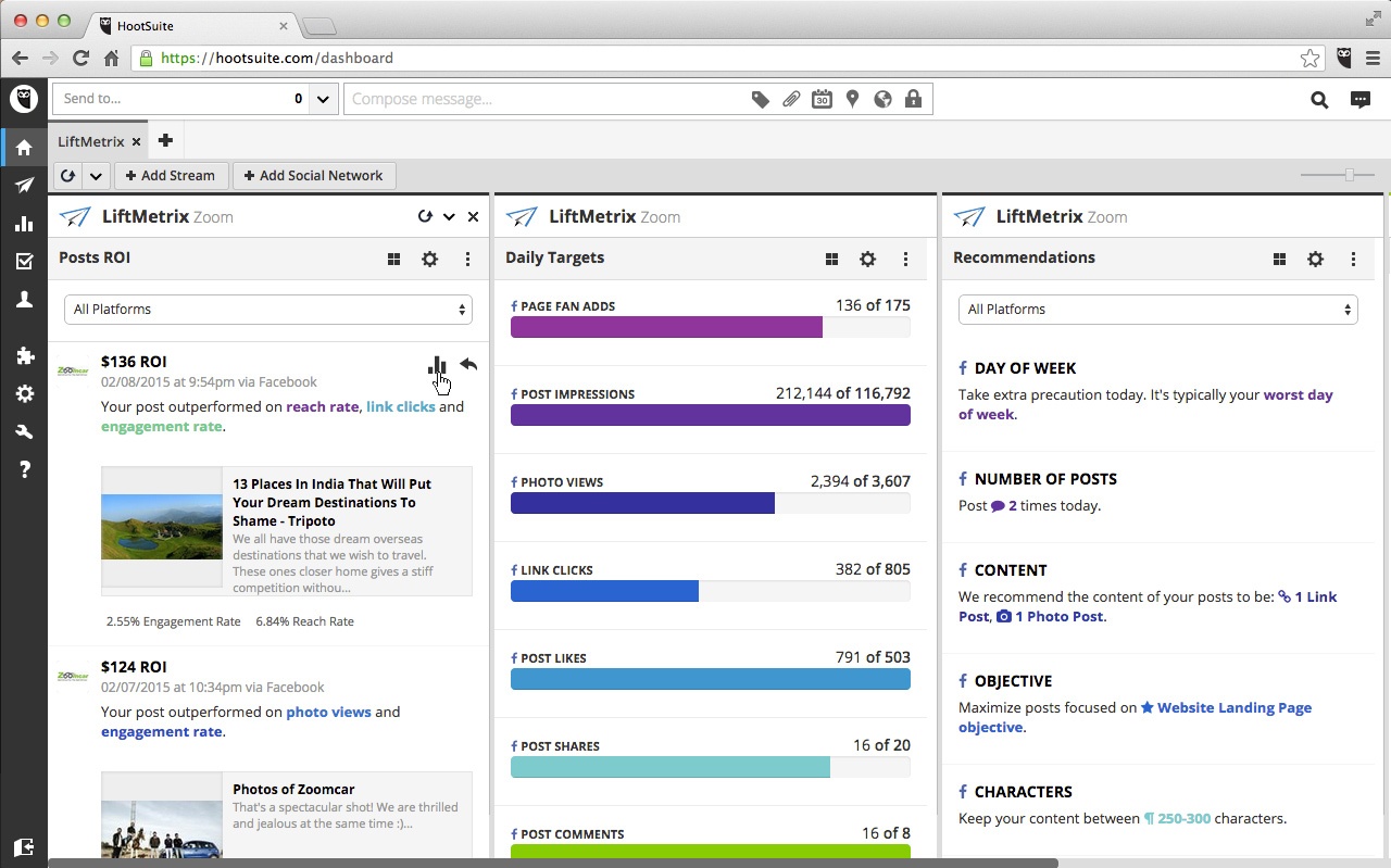 The combined capabilities from the LiftMetrix/HootSuite integration provide a daily customized social media game plan right inside of an industry leading social relationship platform. This means a better answer to your ROI questions, a way to easily adjust your content strategy and see how you compare against your competitors on a post level in one, easy to use place.