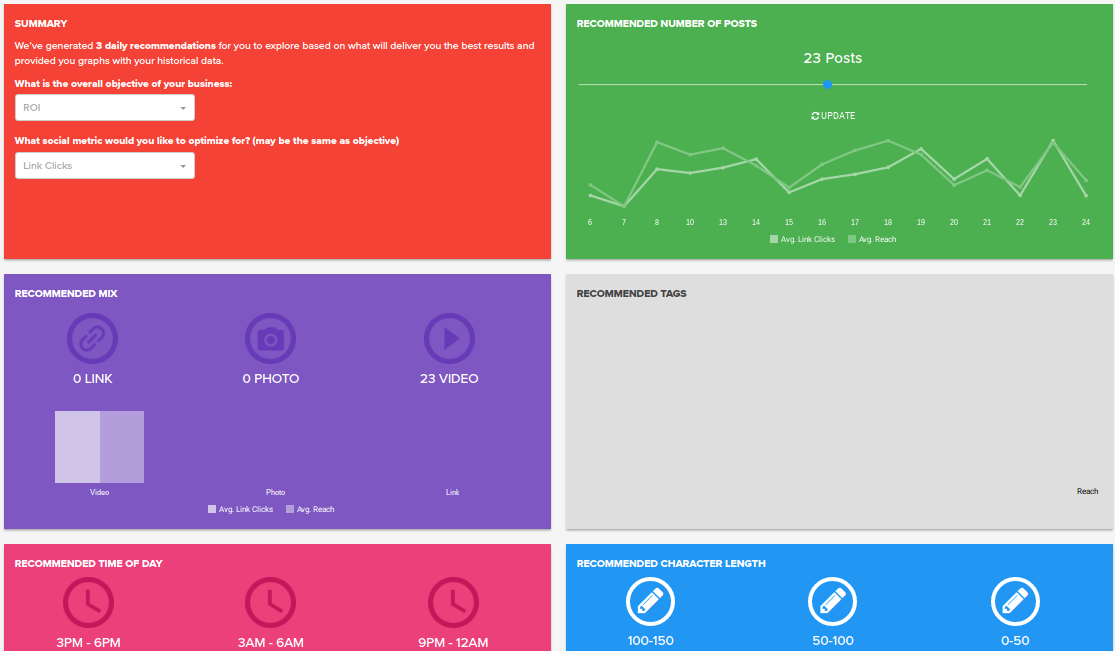 With similar business objectives as to before along with similar values it should be easy to plug in some numbers so you can decide what actions by users might be worth. From there taking into account any expenses (ads, SEO, team costs, etc) you can calculate your ROI. We even outlined these steps in one of our blog posts awhile ago. However with the amount of items and varying levels of relationships with users through Social Media this can be incredibly cumbersome. What’s more once you have it all figured out, how do you know which of those posts or numbers may have been better so you can keep doing it? Or how do you know that Tuesdays, for example, was the best day to post? Tricky.