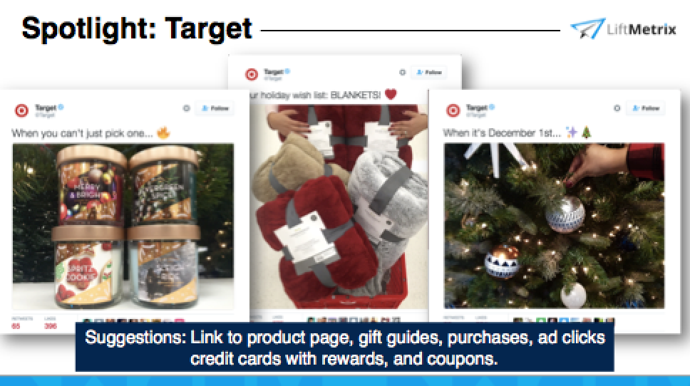 Target could optimize their business objectives by including hashtags and direct links into their tweets. Direct links could drive page views by bringing users to webpages that promote their gift guides, purchases, ad clicks, credit cards and rewards, and coupons.