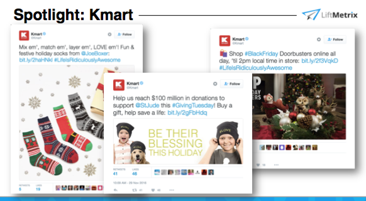Taking a quick look at Kmart's holiday tweets we can see they do a great job moving their user off of social and onto their site. Their tweets feature hashtags, tagged brands and links to their site. These features help drive site conversions. Kmart uses links in their tweets to help direct consumers to their products and their partnership with St. Judes. The addition of links helps Kmart directly measure the impact clicks have on their business objectives.