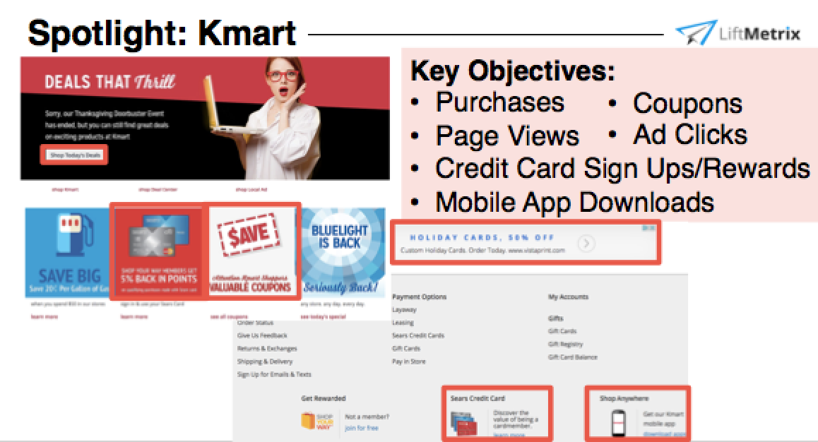 We analyzed Kmart's twitter posts further by clicking on the link provided in their Black Friday tweet. We are redirected to their gift guide site, much like the like2b.uy site Nordstrom used in an earlier blog post. This site drives users to make purchases, use coupons, view more pages, click on ads, sign-up for credit cards and reward programs, and download their app. This site does a great job to help Kmart accomplish their objectives.