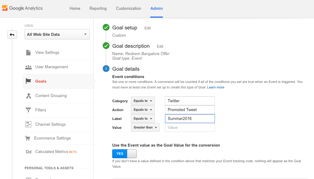 Match the Goal parameter fields exactly to the tags in your UTM links. The new field in this view is “Value”. Here, Zoomcar knows that every new customer that signs up from this offer is worth $5.35 (~25% of leads convert), so they input this dollar value to measure the goal.